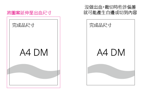 如下左圖,有將圖案做到出血尺寸,裁切誤差通常不會超過此範圍,所以裁切偏差也可以保證成品不會出現白邊或裁切到內容。
